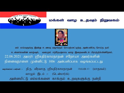 22 06 2021 அமரர் ஸ்ரீகதிர்காமநாதன் சறோயா அவர்களின் நினைவுநாளை முன்னிட்டு 100€ அன்பளிப்பாக வழங்க.....