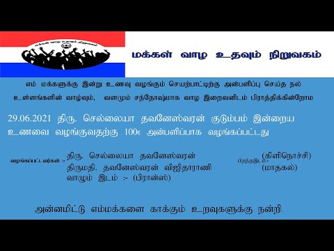29 06 2021 திரு செல்லையா தவனேஸ்வரன் குடும்பம் இன்றைய உணவை வழங்குவதற்கு 100€ அன்பளிப்பாக வழங்க.....
