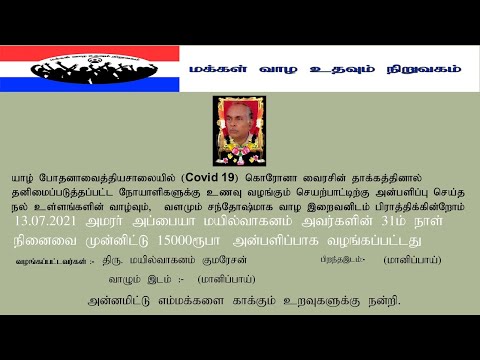 13 07 2021 அமரர் அப்பையா மயில்வாகனம் அவர்களின் 31ம் நாள் நினைவை முன்னிட்டு 15000ரூபா அன்பளிப்பாக ...