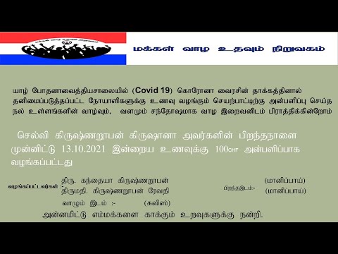 செல்வி கிருஷ்ணறூபன் கிருஷனா அவர்களின் பிறந்தநாளை முன்னிட்டு 13 10 2021 இன்றைய உணவுக்கு .......